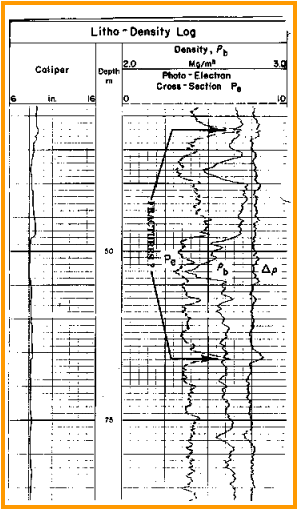 Large PE values, greater than 5.0 cu., especially when weighted muds are used, is a fracture indicator. Barite has a very large photoelectric cross section, 267 as compared with 5.0 for limestone and 3.1 for dolomite. Thus the PE curve should exhibit a very sharp peak in front of a fracture filled with barite loaded mud cake. On the log at the right, two very sharp peaks on the PE curve correspond to fractures. The density correction curve also has a bump for the presence of heavy mud. Corroboration from other sources is essential. In light weight muds, an abnormally low PE value, less than 1.7, indicates, fractures, bad hole condition, or coal.