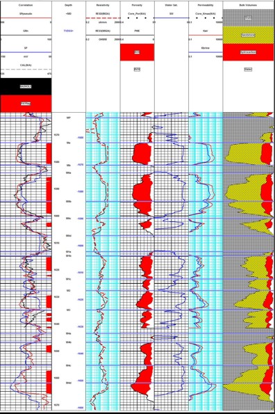 Resistivity was dominated by lateral curves with the blind spot at the top. Standard computer algorithms would have made a water zone at the top of each reservoir layer, so we used Buckle's number to generate Swb = KBUCKL / PHIe / (1 - Vsh). This worked well as there was no need to zone for water.